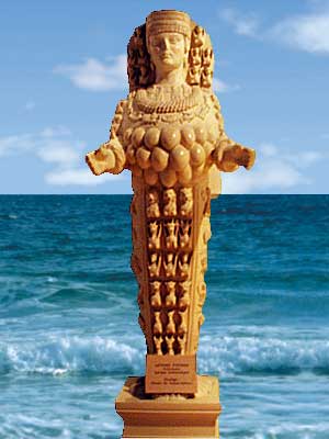 Kopie einer Statue der Göttin Artemis von Ephesus. Historisches Museum von Marseille. Der Körper ist mit Tieren bedeckt, die Büste mit Stierhoden. Artemis ist somit die Beschützerin der Tiere und die Göttin der Fruchtbarkeit (1) |