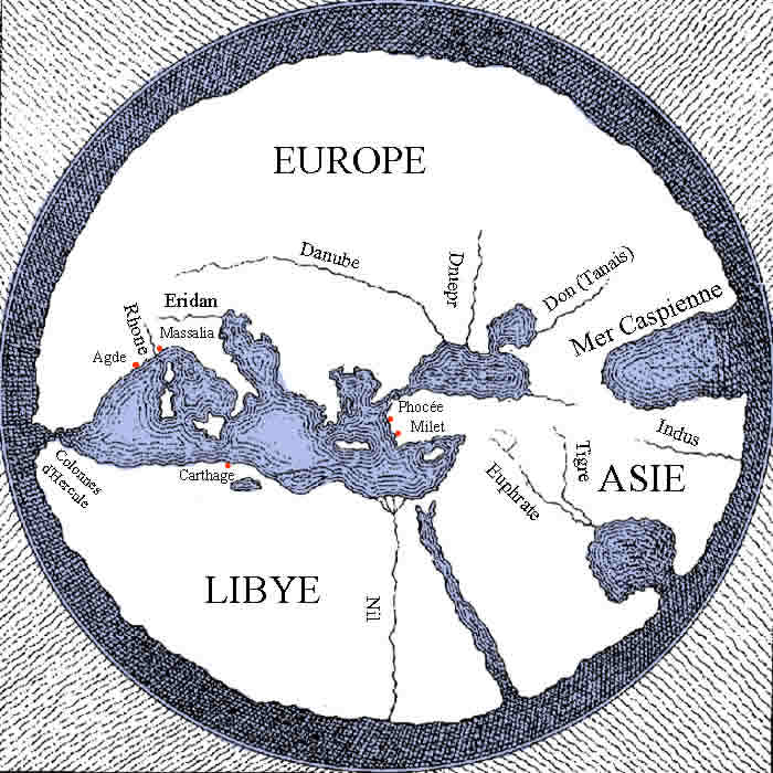 Um +450 n. Chr. begab sich ein Massaliote (Marseillais) namens Euthymenes, dessen Statue die linke Fassade des Börsenpalastes schmückt, auf eine Reise in Richtung Südatlantik. Er sagt, der Atlantik sei kalt und er beobachte Lebewesen wie die im Nil. Ihm zufolge entsteht der Nil aus dem Atlantik, indem man die Kraft der Wellen beobachtet, die in einen Fluss eindringen. Wie weit ist er gegangen? An der Mündung des Senegal oder weiter an der Mündung des Niger? Oder hat er einfach wiederholt, was er gehört hat? Im Gegensatz zu Pytheas, der 100 Jahre später abreiste, muss er durch den fehlenden Kontakt zu den Eingeborenen und die geringe kommerzielle Attraktivität behindert worden sein. Was das Innere Europas betrifft, herrscht im IV. n. Chr. einfach völlige Unwissenheit. Die Griechen, Phönizier und Etrusker waren im Wesentlichen Seefahrer, und obwohl sie mit „barbarischen“ Völkern Handel trieben, gingen ihre Erkundungstouren nicht über den Küstenstreifen hinaus. So soll die Donau in den Pyrenäen entspringen! Nordeuropa wird abgerundet und schließt sich Indien an. Der gesamte nördliche Teil ist unbewohnt, weil es zu kalt ist.